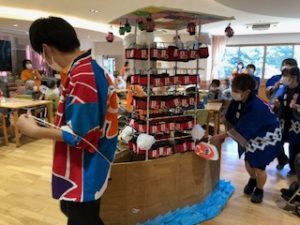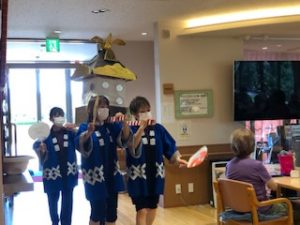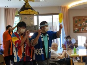 「祭り」の曲に合わせて、職員がお神輿をかついで、にぎやかに本日の夏祭りが終了!!