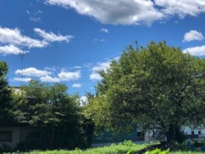真っ青な空と、白い雲、そしてフラワーヴィラの畑にある梅の木の緑が、とても鮮やかで綺麗でした。